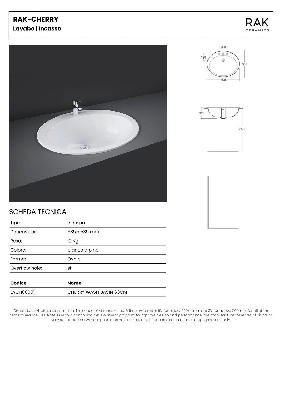 LAVABO Cherry da incasso Soprapiano 63,5x53,5x22,5cm Rak Ceramics